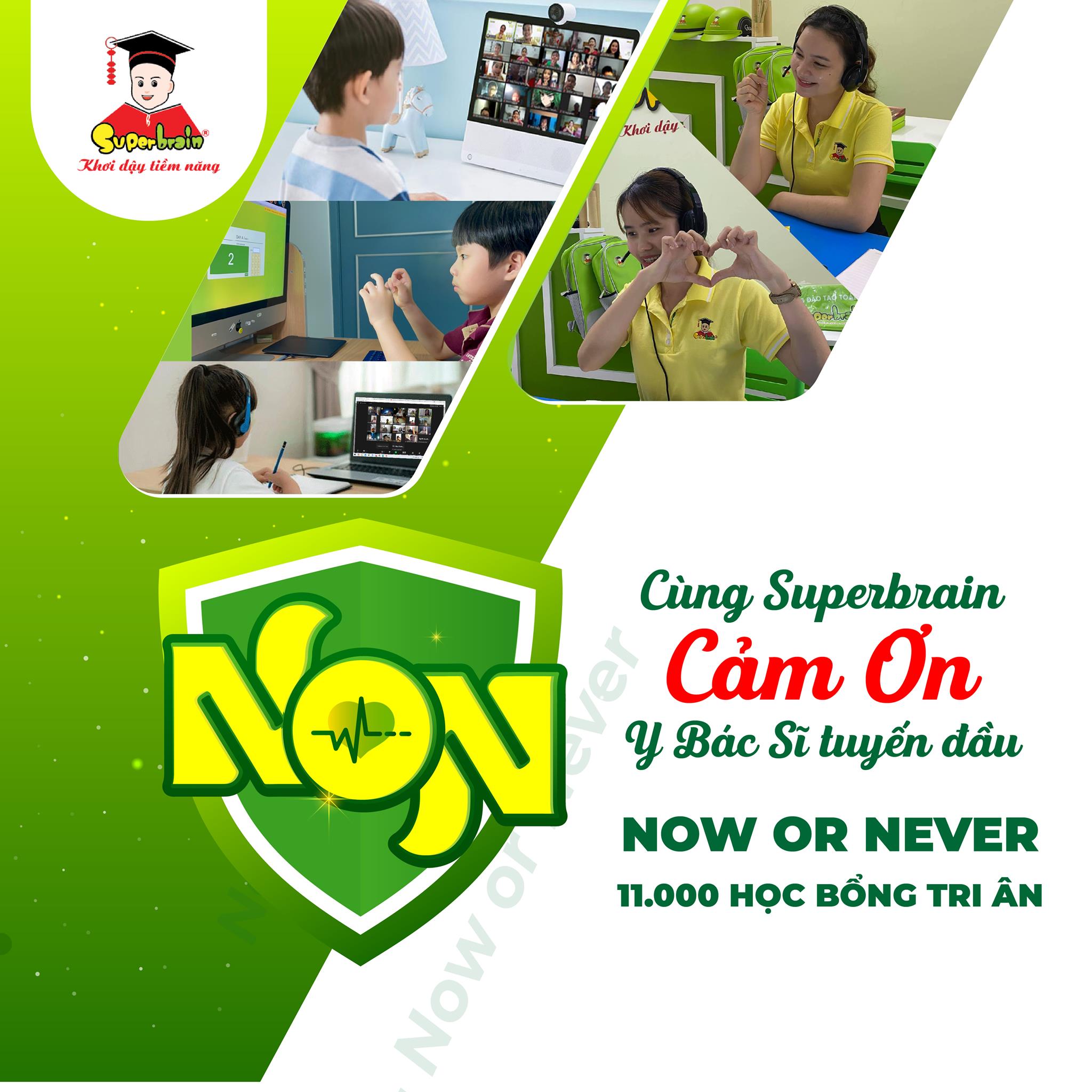 NoN – Now or Never, chương trình thiện nguyện nguyện lớn nhất từng có của Superbrain. Để tri ân các y bác sĩ đang căng mình chống dịch, Superbrain đã quyết định trao 11000 suất học bổng cho con của các y bác sĩ. Không chỉ là tri ân, mà đây còn là thể hiện trách nhiệm xã hội của Superbrain với cộng đồng, với xã hội.