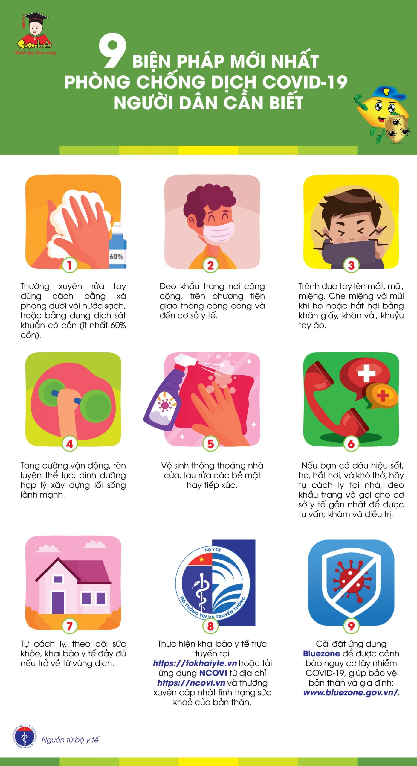 Cả nhà cùng lưu ý cập nhật, thực hiện đầy đủ 9 BIỆN PHÁP MỚI NHẤT PHÒNG CHỐNG DỊCH COVID-19 theo khuyến cáo của Bộ Y Tế nhé!