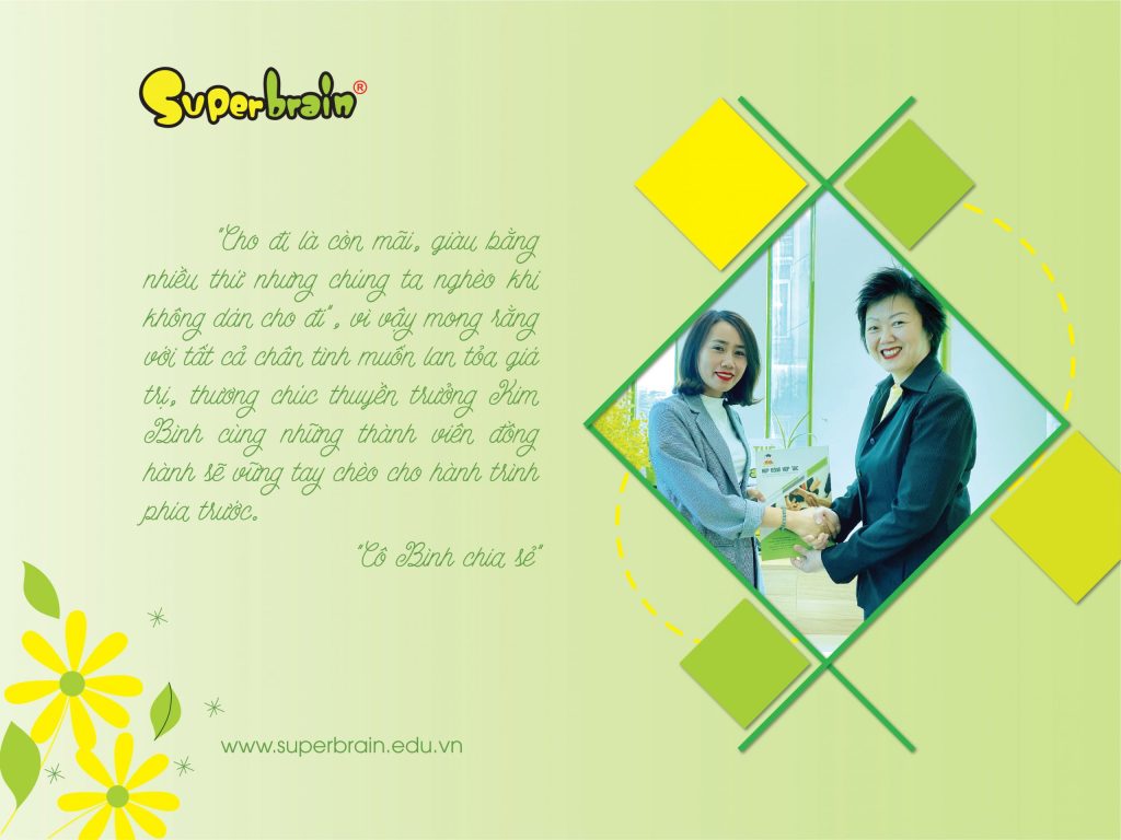 Với xuất phát điểm là hiệu trưởng một trường mầm non, cô Bình vẫn luôn trăn trở về việc tạo ra một môi trường giáo dục đổi mới, tích cực và tràn đầy năng lượng. Tình cờ biết đến mô hình Toán trí tuệ Superbrain qua lời giới thiệu từ bạn bè, cô đã tìm thấy định hướng lý tưởng cho sứ mệnh của mình.
